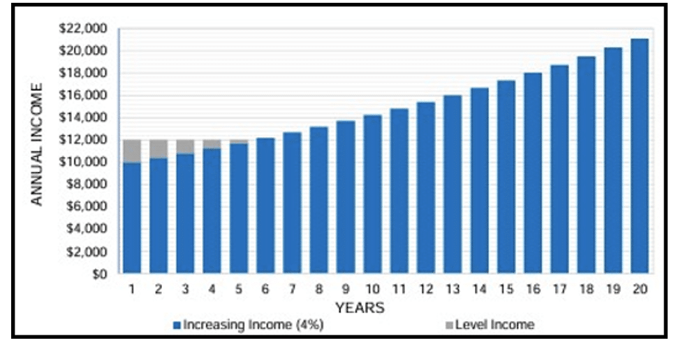 The example below provides increasing income, which handily beats the level income solution even though it starts off trailing the returns.