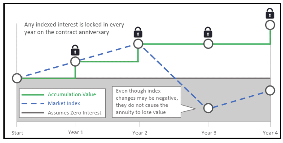 The annual reset feature looks only at the change during that individual contract year and because a fixed index annuity provides principle protection, you cannot lose value due to negative index performance. So, if the index performance is positive for that year, even if it has not recovered prior year losses, your contract will receive an interest credit.